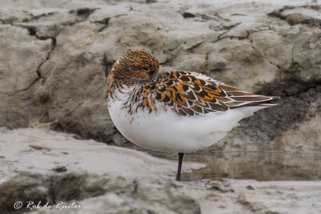 - De vogel slaapt vaak terwijl hij op één poot staat, een houding die helpt om lichaamswarmte te besparen tijdens rustperiodes op winderige stranden.