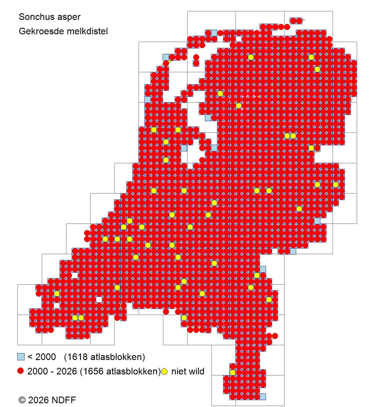 ![]() Verspreidingskaart gekroesde melkdistel @ 2026 NDFF FLORON Verspreidingsatlas Vaatplanten | |