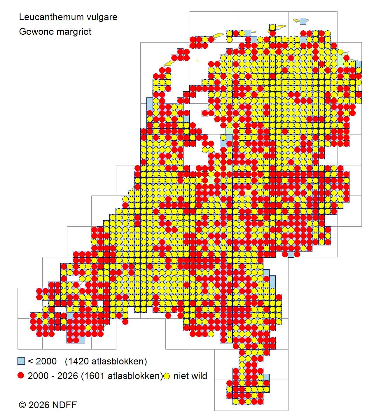![]() Verspreidingskaart gewone margriet @ 2026 NDFF FLORON Verspreidingsatlas Vaatplanten | |