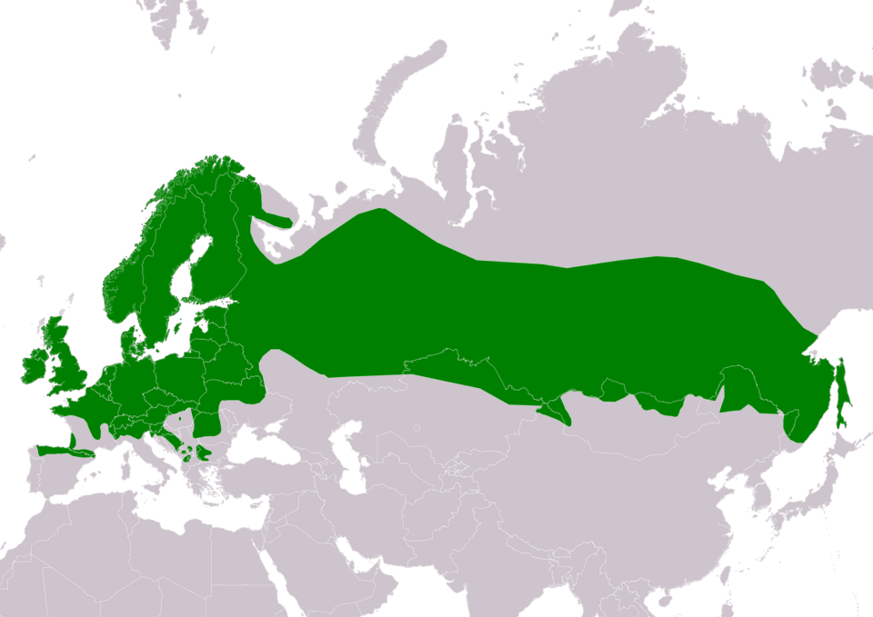 Deze enorme geografische spreiding is mogelijk dankzij de uitzonderlijke aanpassing van de soort aan koude klimaten, waarbij sommige populaties tot 350 kilometer ten noorden van de poolcirkel voorkomen en in bergachtige gebieden tot hoogtes van 2900 meter boven zeeniveau leven. De soort is dus verspreid over het volledige Euraziatische continent en komt voor in een breed scala aan klimaten en landschappen, van laagland tot alpine zones.