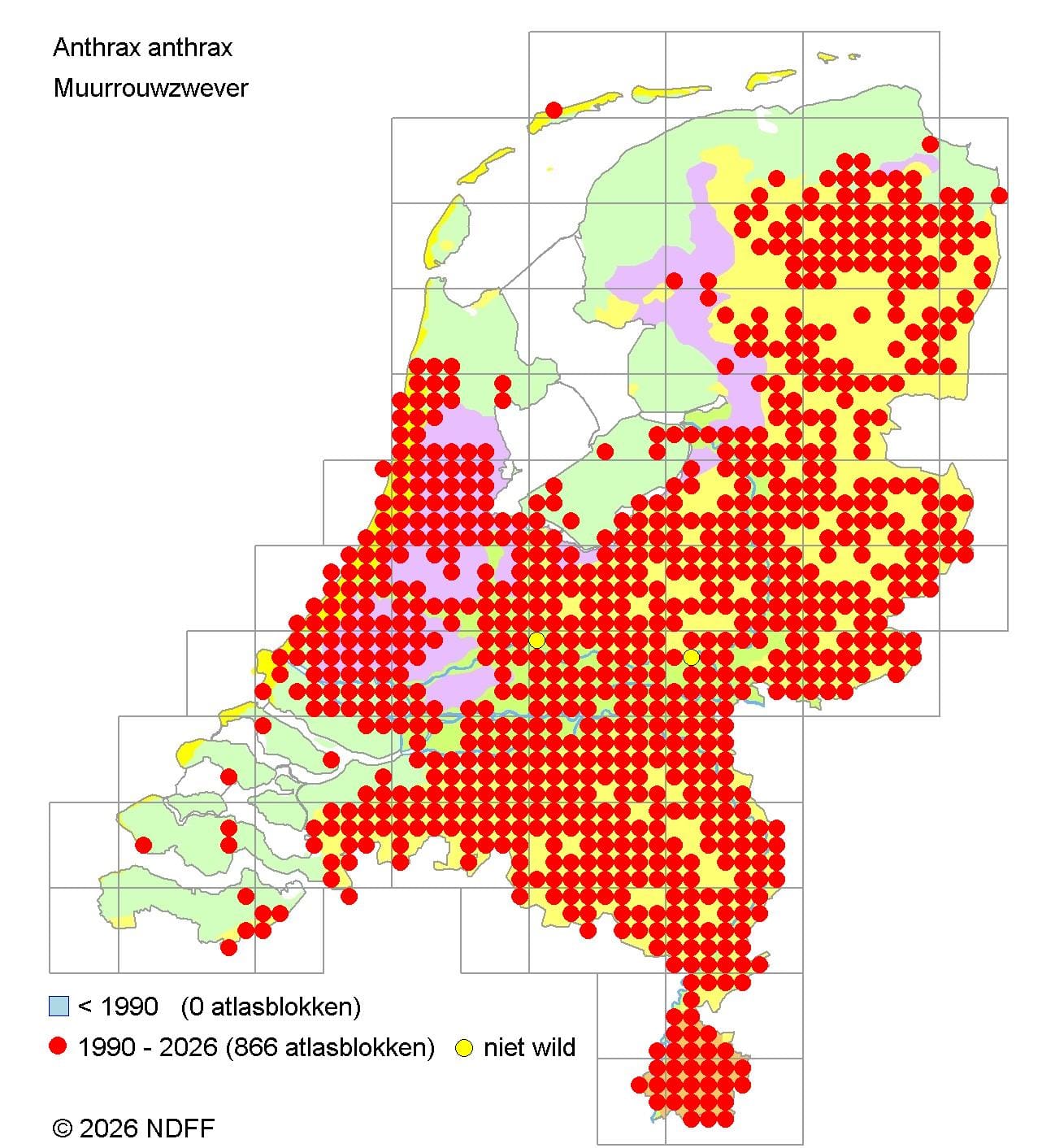 ![]() Verspreidingskaart muurrouwzwever @ 2026 NDFF EIS Verspreidingsatlas Insecten | |