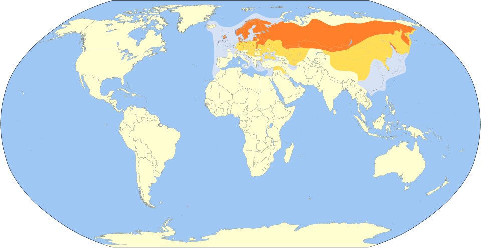 | Legenda: __ Broedgebied __ Permanent leefgebied __ Niet-broedgebied __ Doortrekgebied | |