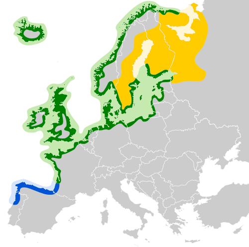 | Legenda: __ Broedgebied __ Permanent leefgebied __ Overwinteringsgebied | |